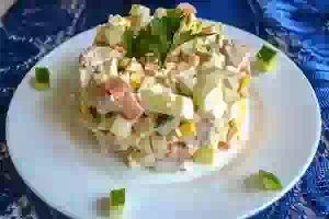 Слоеный салат из курицы с картофелем, жареными шампиньонами и сыром