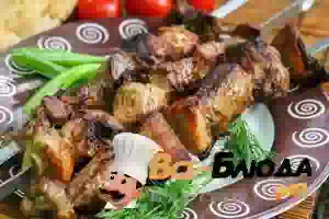 4. Нанизать промаринованную свинину на шампуры, оставляя между кусочками мяса небольшие промежутки.