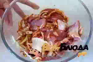 5. С мяса слить минералку. Добавить кусочки свинины к луку, выдавить сок из половинки лимона, хорошо перемешать и убрать в холодильник мариноваться на 2 часа.