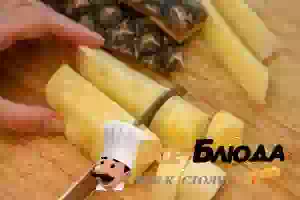 3. Ананас разрезать пополам. Половину ананаса еще раз разрезать и удалить твердую кочерыжку. Срезать кожуру, а мякоть нарезать кусочками примерно того же размера, что и куриная грудка.