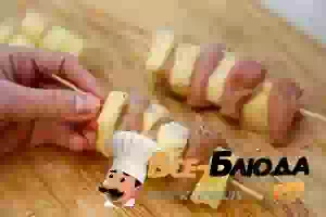 4. На бамбуковые шпажки нанизать кусочки курицы, чередуя с ананасом.