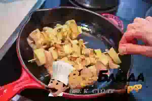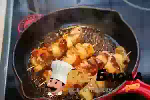8. После этого переложить куриные шашлычки с ананасами в сковороду, готовить, переворачивая с одного бока на другой по несколько раз, чтобы загустевший соус обволакивал кусочки курицы и ананас со всех сторон. Если соус начнет быстро выкипать, можно подлить немного воды из чайника и размешать. Куриные шашлычки с ананасами на шпажках подавать горячими с гарниром по вкусу.