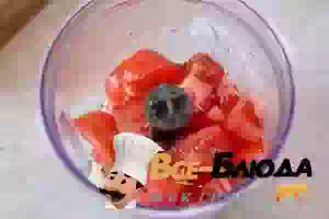 3. Добавить помидоры и еще раз пробить в блендере, чтобы получилась томатная кашица. Томатный маринад готов.