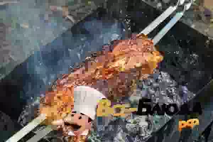 7. Спустя 40 минут аккуратно развернуть фольгу и вернуть мясо на мангал. Держать над углями примерно 10 минут, переворачивая с одного бока на другой. Проверить готовность мяса, проткнув грудинку в самом толстом месте мясного куска. Если вытекает прозрачный сок без примесей крови, то шашлык готов. Готовую грудинку переложить на неиспользованный лист фольги, плотно завернуть, переложить на блюдо и оставить в таком виде на 10 минут. Снять грудинку с шампуров, нарезать ломтиками и подавать с зеленью, овощами и лепешкой.