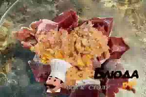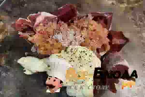 1. Свиное сердце хорошо промываем под проточной водой. Все протоки, нарезаем мясистую часть на куски размером примерно 3х3 см. К нему добавляем мелко нарезанный лук и лимон.