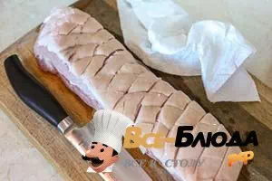 1. Свиную грудинку промыть под проточной холодной водой, обтереть досуха бумажными полотенцами. Острым ножом надрезать ромбиками кожу, прорезая слой сала, но, не доходя до слоя мяса.
