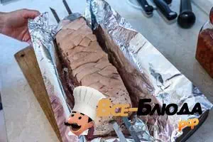 3. Промаринованную грудинку насадить на шампуры, проткнув ими мясо по всей его длине. Перед укладкой на мангал, обернуть грудинку в 2 слоя фольги.