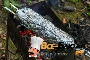 5. Уложить грудинку в фольге над хорошо прогоревшими углями в мангале и жарить 10 минут сначала с одной стороны, затем перевернуть и продолжить готовить 10 минут с другой стороны.