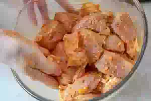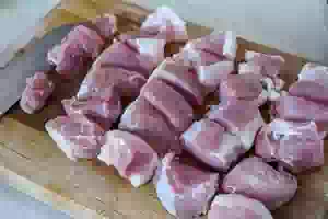5. Мякоть свинины вымыть под проточной холодной водой, обсушить на бумажных полотенцах и порезать кусочками размером 3х3 см.