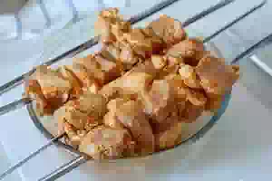 7. Маринованное мясо заранее достать из холодильника, чтобы оно успело согреться. Нанизать мясо на шампуры.