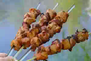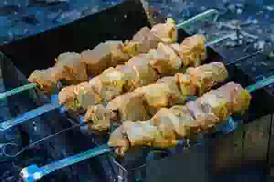 8. Жарить шашлык из свинины в лимонном маринаде на углях до готовности. Свинина готовится быстро, поэтому следите за огнем, переворачивайте шампуры.