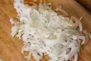 2. Репчатый лук очистить, порезать кольцами толщиной около 5 мм, посыпать солью, молотыми семенами кумина, черным перцем и хорошо помять руками, чтобы лук дал сок.