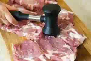 3. Каждый кусок мяса отбить специальным молотком или рукояткой ножа, чтобы ломтики стали мягче и тоньше. Удобнее проделывать это, положив свинину между двумя слоями пищевой пленки. Но не повредите их целостность, иначе будет сложнее скручивать рулетики.