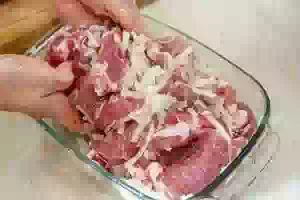 4. В подходящей по объему миске перемешать мясо с луком. Накрыть миску с мясом пищевой пленкой и убрать в холодильник на 2 часа или на ночь.
