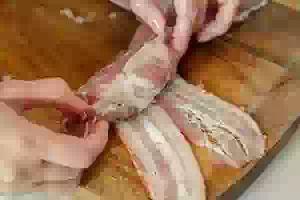 8. Острым ножом с широким лезвием разрезать каждый рулетик поперек на 2 кусочка.