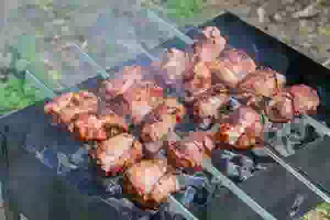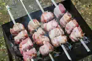 10. Подготовить угли в мангале. Разместить шампуры с шашлыками из мясных рулетиков швом вниз, чтобы рулетики запечатались, и им было труднее разворачиваться. Жарить над углями до готовности, поворачивая шампуры с мясом с одного бока на другой.