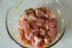 1. Свинину без костей с прослойками жира вымыть под холодной проточной водой, обсушить бумажными полотенцами и порезать кубиками примерно одного и того же размера 3х3 см.