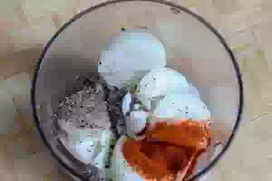 2. Для маринада в чаше блендера соединить крупно нарезанный очищенный лук, добавить сладкую молотую паприку, молотый черный перец или смесь молотых перцев, соль и растительное масло.