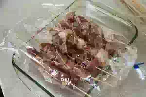 4. Смешать в миске мясо с маринадом, затянуть пленкой и поставить в холодильник на 1-2 часа. Параллельно замочить бамбуковые шпажки в воде, чтобы они набухли и не горели в духовке.