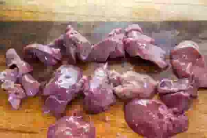 1. Подготовить куриную печень для шашлыка: срезать протоки, проверить, не осталось ли желчного пузыря, после этого промыть в холодной воде и обсушить на бумажных полотенцах. Порезать печенку на дольки примерно одного размера. Так шашлык на шампуре будет смотреться аккуратнее, да и кусочки печенки приготовятся одновременно и не пересохнут.