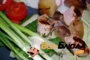 5. Все смешать и поставить в холодильник под закрытой крышкой на 5-6 часов. Далее режем кольцами лук и кубиками нарезаем печеный картофель.