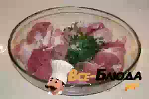 1. Нарезать «шашлычными» кусочками мясо. Для шашлыка можно взять шейку, но очень хорошо также получается с корейкой или лангетом.