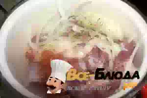 3. Смешать лук со специями и уксусом, замариновать мясо. Убрать емкость с шашлыком в прохладное место на 3 часа.