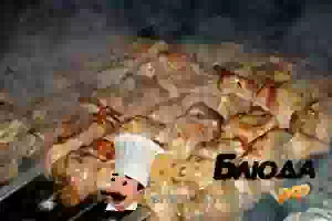7. Нанизать на шампуры мясо, чередуя его с кусочками сала. Посыпать мукой и запечь на углях.