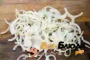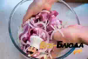 2. Для приготовления маринада репчатый лук очистить, порезать кольцами или полукольцами толщиной около 5 мм. Посыпать нарезанный лук солью и помять руками, чтобы он дал сок.