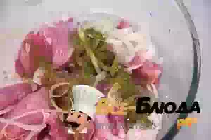 3. Переложить в миску мясо и лук с солью. Перемешать, стараясь хорошо обмять мясо, чтобы каждый кусочек оказался покрыт слоем лука.