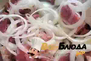 1. Мясо режем на примерно одинаковые по размеру куски, кладем в большую кастрюльку или миску.