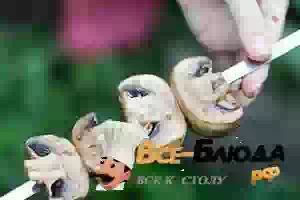 4. Шампиньоны насадить на шампуры. К этому моменту угли в мангале должны хорошо прогореть.