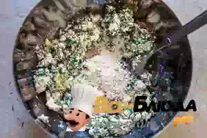 4. Всыпать в миску с творогом муку. Добавлять муку по частям, постепенно, чтобы тесто получилось нужной консистенции.