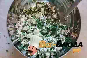 2. Пучок укропа вымыть под струей холодной воды, обсушить на бумажном полотенце и мелко порезать. Добавить рубленый укроп к творогу, перемешать.