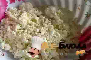 1. Сначала подготовьте мак: высыпьте его в тарелку, залейте кипятком, оставьте на 1 час. В глубокую посуду положите творог, разомните крупные комки.