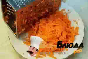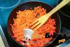 2. На сковородке растопить кусочек сливочного масла, добавить тертую морковь и тушить на небольшом огне до мягкости моркови.
