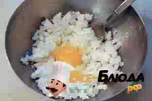3. Размять в миске творог. Добавить сахар и яйцо. Все перемешать.