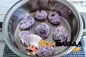 5. Слепить из теста небольшие творожники и переложить на сковороду или в сотейник с предварительно прогретым маслом. Жарить на небольшом огне 4-5 минут. Перевернув каждый сырник, жарим еще несколько минут. Черничные мраморные сырники переложить на тарелку и подавать горячими со сметаной.