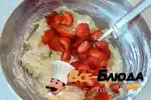 6. Проверить творожное тесто. Оно должно быть густым, не текучим. По мере необходимости модно добавить еще манки и после этого оставить примерно 10 минут. Следом примешать нарезанную клубнику, чтобы она равномерно распределилась в тесте.