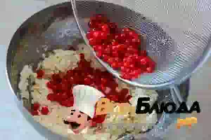 4. Ягоды красной смородины отделить от веточек, вымыть, откинуть на дуршлаг, затем обсушить на бумажном полотенце. Можно дополнительно обвалять ягоды в муке и после этого высыпать их в творог. Аккуратно перемешать, чтобы не раздавить ягоды.