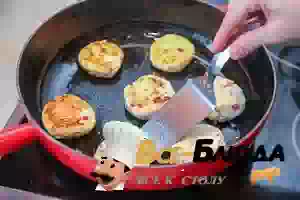 9. и обжаривать на разогретой сковороде с маслом на небольшом огне. Сначала подрумянить одну сторону, аккуратно перевернуть на другую и жарить до готовности. Горячие сырники с красной смородиной переложить на блюдо и подавать со сметаной. Вкусно.