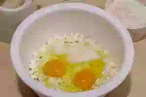 1. Если хотите, чтобы готовые сырники были однородными, мягкими, то протрите творог через сито. Если творожные крупинки в сырниках вас не смущают, достаточно размять творог вилкой, добавить яйца, обычный и ванильный сахар.