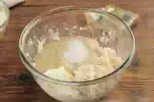 8. Всыпаем примерно половину (75 г) муки. Замешиваем бананово-творожное тесто для сырников.