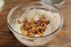 7. Пропаренный изюм отбрасываем на сито. Добавляем в бананово-творожную массу. Перемешиваем.