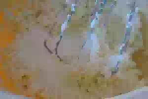 2. К творогу добавить яйца, соль, сахар, ванильный сахар, сметану. Хорошо взбить.