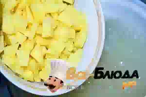 2. Картофель очистить, нарезать мелкими кубиками и переложить в кастрюлю. Довести бульон до кипения, уменьшить огонь и варить еще 5 минут.