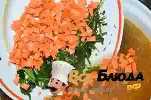 4. Морковь порезать мелкими кубиками. Петрушку измельчить ножом. Вслед за килькой отправить в суп морковь и зелень.