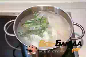1. Сначала надо сварить крепкий рыбный бульон. Для этого в кастрюлю уложить рыбные головы (предварительно удалив жабры и глаза) и скелет рыбы, добавить целую луковицу, морковь и стебли укропа. Варить на слабом огне, снимая пену, около 20 минут. Затем бульон процедить, выбросить кости. Добавить несколько горошин черного перца и лавровый лист.