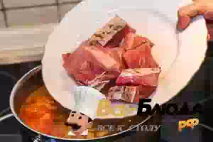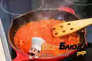 2. В глубокой сковороде пассеровать на сливочном масле нарезанный полукольцами лук, добавить помидоры в собственном соку и тушить, помешивая, около 5 минут. Переложить получившуюся томатную массу в кастрюлю с бульоном, довести до кипения, после чего уменьшить нагрев и продолжать варить.