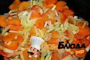 2. Лук, сельдерей и морковь нашинковать и спассеровать до мягкости в масле. Картофель нарезать на крупные кубики.